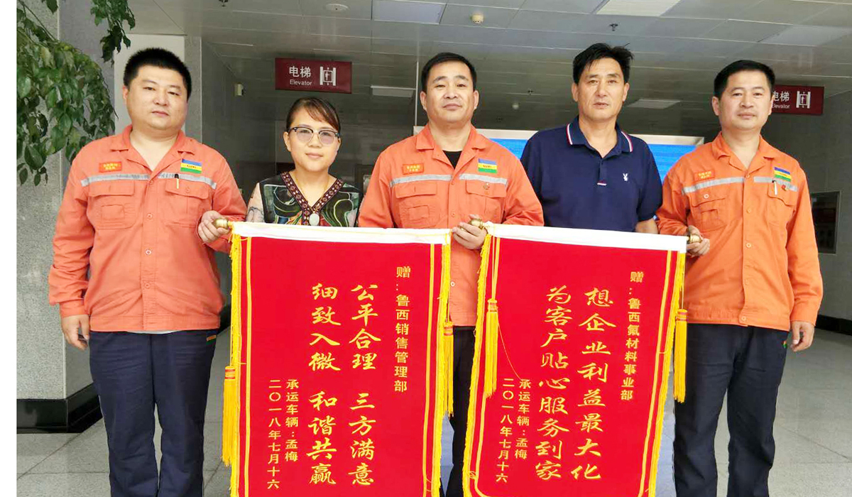 ? ? ? ?7月30日,東阿明鑫物流公司車輛負(fù)責(zé)人王長(zhǎng)義、孟梅來(lái)到魯西集團(tuán),激動(dòng)地將印有“公平合理 三方滿意 細(xì)致入微 和諧共贏”、“想企業(yè)利益最大化 為客戶貼心服務(wù)到家”字樣的兩面錦旗送到銷售管理部物流管理人員李登旭和氟材料事業(yè)部銷售經(jīng)理?xiàng)钕绕焓种校B聲感謝。并向記者講述了一則魯西集團(tuán)員工公平公正妥善處理虧噸事件的故事。