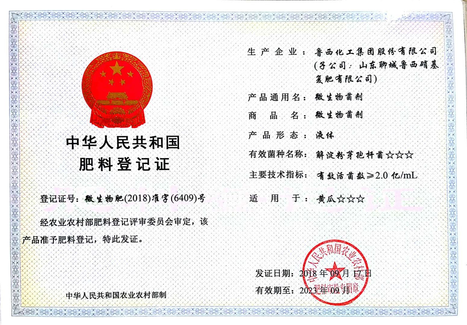 ? ? ? 10月7日,收到了農業農村部肥料評審登記管理處寄來的魯西集團農業用微生物菌劑肥料登記證書,共涉及兩個菌種:解淀粉芽孢桿菌、多粘類芽孢桿菌。登記證號分別為“微生物肥(2018)準字(6409)號”、“微生物肥(2018)準字(6410)號”。登記證有效期至2023年9月。