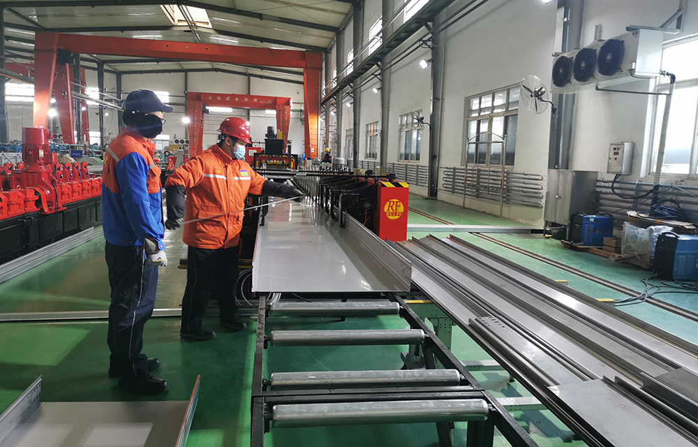 記者通過橋架生產線負責人姚建忠了解到,橋架生產線設備安裝到位后,組織技術骨干力量成立學習小組,對設備的技術參數進行學習,熟練掌握了板材對中、壓輥間隙、成型角度等調試方法,使不銹鋼鋼板剪、沖、折一次成型,確保了生產過程的零失誤。在后續加工中又不斷解決焊點氧化層、卷邊毛刺等問題,保障了產品質量。經過不斷改進提升,現如今不銹鋼橋架日產量達300余米,初步滿足生產要求。