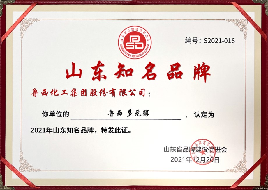 近日, 山東省品牌建設(shè)促進(jìn)會在品牌年會上發(fā)布2021年度山東知名品牌認(rèn)定名單,魯西集團(tuán)“多元醇”產(chǎn)品榜上有名,榮獲“山東知名品牌”。