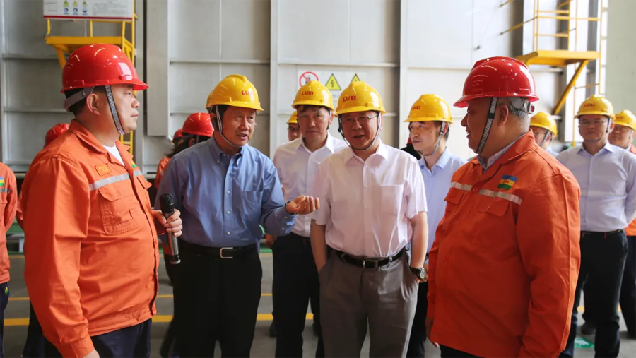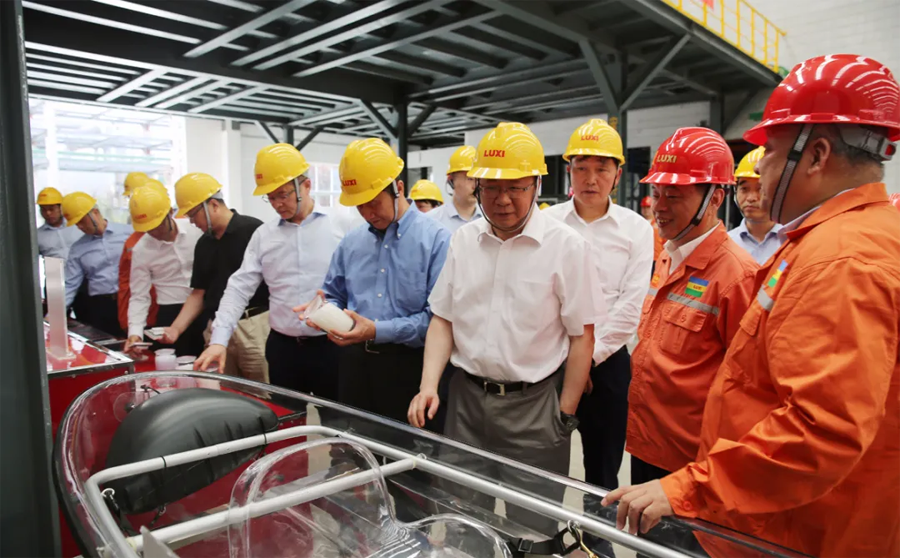 領(lǐng)導(dǎo)一行先后參觀了園區(qū)重型裝備、應(yīng)急救援中心、尼龍6和聚碳酸酯包裝現(xiàn)場(chǎng)、廢水零排放、氣化爐、固廢處置現(xiàn)場(chǎng)、技術(shù)中心大樓和展廳。領(lǐng)導(dǎo)一行進(jìn)車間、看現(xiàn)場(chǎng)、聽介紹,和員工攀談。現(xiàn)場(chǎng)了解了化工工程裝備的強(qiáng)大制造能力,吸收再創(chuàng)新能力和先進(jìn)的自動(dòng)化水平;觀看了魯西應(yīng)急消防設(shè)施配備和應(yīng)急隊(duì)員綜合科目訓(xùn)練展示;了解了尼龍6和聚碳酸酯的產(chǎn)能、技術(shù)水平、下游產(chǎn)品和市場(chǎng)前景,以及氣化爐的核心技術(shù)優(yōu)勢(shì);聽取了關(guān)于園區(qū)零排放目標(biāo)實(shí)施,建設(shè)綠色化工園區(qū)、智慧化工平臺(tái)建設(shè)和較高資質(zhì)設(shè)計(jì)能力的匯報(bào);并且通過參觀展廳,細(xì)致了解了集團(tuán)的發(fā)展歷程、目前的發(fā)展?fàn)顩r和未來的發(fā)展規(guī)劃。