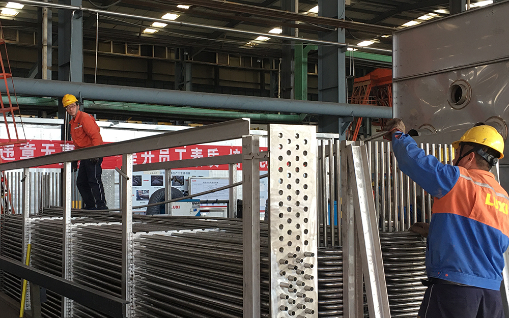 走進第一工程事業(yè)部設備制作廠房,陳興勛主任正在現(xiàn)場指導蒸發(fā)冷管束組對工作,他告訴記者:“公司接到制作循環(huán)水蒸發(fā)冷的制作任務后,與技術人員進行辨識,制作循環(huán)水蒸發(fā)冷管束可以利用自行拆解與其他單位拆解退庫的Φ25不銹鋼管,將不銹鋼管進行內(nèi)、外拋光兩道工序,確保換熱管見金屬光澤、表面清潔、無污垢后進行打壓試驗,挑選合格的管子進行齊口、截取、拼接、焊接成所需要的長度,利用校直機進行校直,再利用彎管機進行彎制蒸發(fā)冷所需長度的盤管,打壓合格后利用到循環(huán)水蒸發(fā)冷設備的制作中。”
