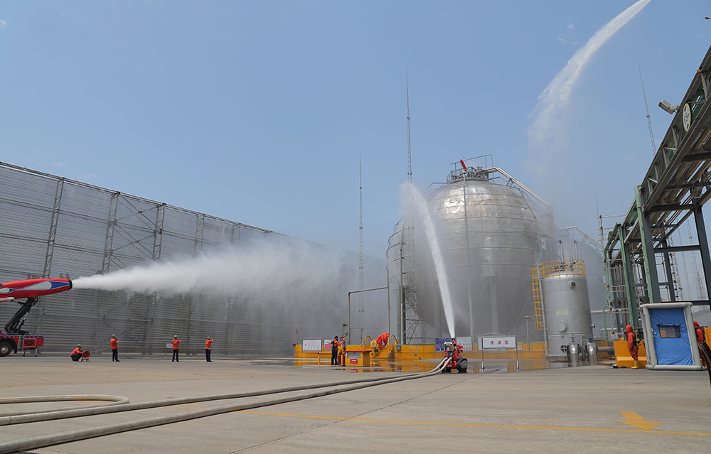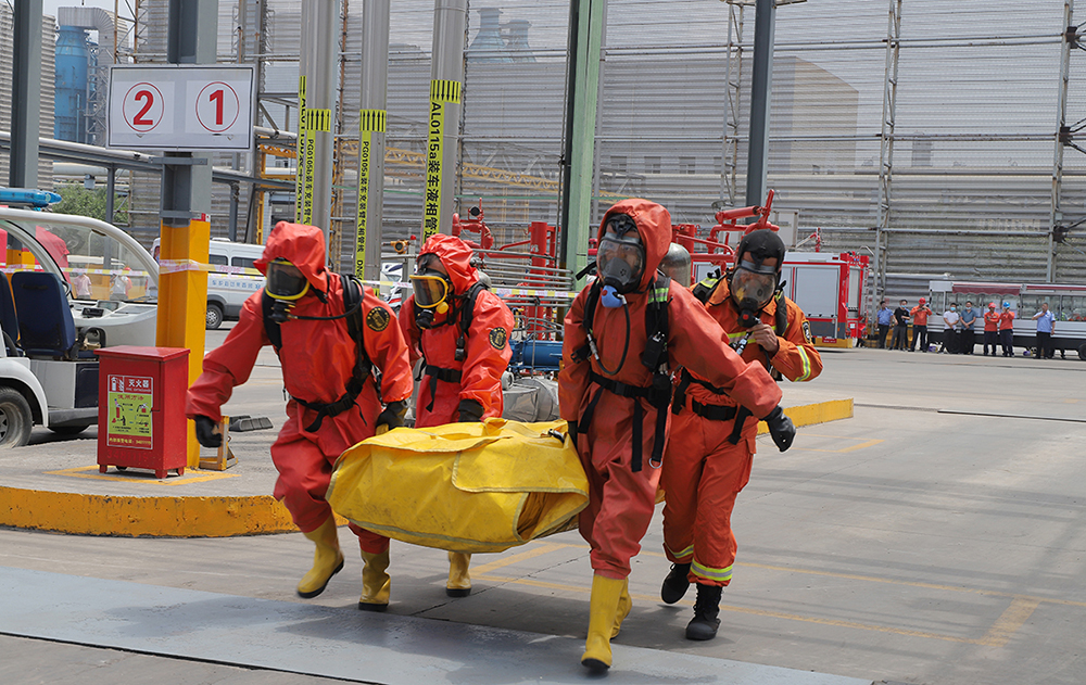 本次演練設定煤化一事業部液氨球罐區發生泄漏。演練過程采取實兵、實裝、實景、實訓,突出上下聯動、部門協同,模擬危化品企業氨氣泄漏事故發生后,企業開展先期自救,市、區等各級政府根據應急預案組織各相關單位和應急救援隊伍開展搶險救援。同時,利用無人機實施全方位、多角度實地偵查,有序開展處置工作,周密部署應急搶險救援工作,成功處置了泄漏險情,演練取得圓滿成功。